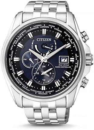 This solar powered watch recharges itself in any kind of light,This solar watch does not require any battery replacement. -The watch has a calendar function: Date, Solar Powered, Radio Controlled, 24-hour Display, Worldtime, Luminous Hands High quality 21 cm length and 21 mm width Silver Stainless steel strap with a Fold over with push button clasp Case diameter: 44 mm,case thickness: 12 mm, case colour: Silver and dial colour: Blue Water resistant: 20 bars -Weight: 182 g