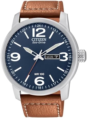 Offering both style and comfort, the Citizen Men's Eco-Drive watch fits close the wrist with its brown strap. This three hand model features a blue dial to finish off a great looking product. It's water resistant to 100m, making it ideal for daily usage. Featuring Eco-Drive technology – powered by light, any light. Never needs a battery.