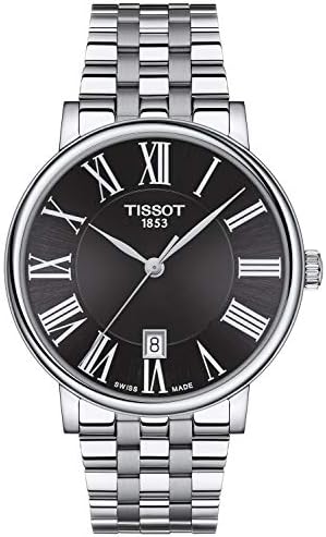 Classic watch for men, from the T-Classic collection, Swiss made quartz movement ETA F06.115, display of hour, minute, second and date, black dial, partially with sunburst, polished hands and Roman numerals, polished 316L stainless steel case, sapphire glass, 316L stainless steel strap, matte and polished, butterfly folding clasp with push buttons, waterproof up to a pressure of 5 bar, diameter 40 mm. Height: 7 mm.