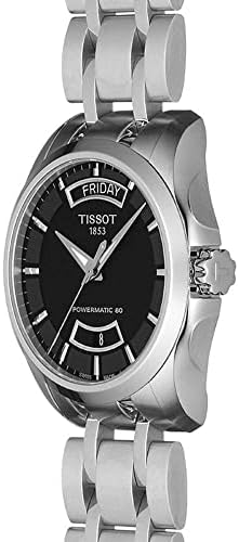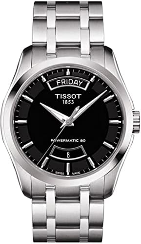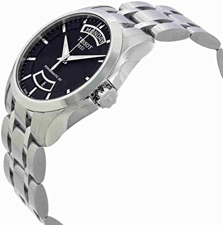 Stainless steel case with a stainless steel bracelet. Fixed stainless steel bezel. Black dial with silver-tone dauphine-style hands and index hour markers. Minute markers around the outer rim. Dial Type: Analog. Date display at the 6 o'clock position. Day of the week display centered on the 12 o'clock position. Tissot Calibre Powermatic 80 (C07.111) Automatic movement, based upon ETA 2824-2, containing 23 Jewels, bitting at 21600 vph, and has a power reserve of approximately 80 hours. Scratch resistant sapphire crystal. Pull / push crown. Transparent case back. Round case shape. Case size: 39 mm. Case thickness: 10.8 mm. Band width: 22 mm. Band length: 7.75 inches. Butterfly clasp. Water resistant at 100 meters / 330 feet. Functions: date, day, hour, minute, second. Casual watch style. Watch label: Swiss Made. Tissot Couturier Powermatic 80 Automatic Men's Watch T0354071105101.