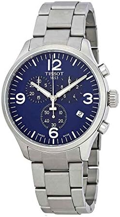 Tissot men's watch Chronograph analog leather strap model T116.617.11.047.00 Chrono XL. Watch with 316L steel case, diameter of 45 mm, blue dial with scratch-resistant sapphire crystal, date, quartz movement chronograph. Steel strap with standard button closure. Waterproof watch up to 10 Bar, equipped with functions: 30 minutes and 1/10 seconds counters. 60 second central chronograph hand. ADD and SPLIT functions.