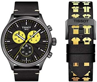 The Tissot Chrono XL Tour de France Special Edition 2019 is a sporty, precise quartz chronograph with a durable leather watch strap and clear yellow fields to display the measurement of hours and minutes. In addition, there is a second bracelet with stylized yellow jersey prints to change. The black dial is protected by a 316L stainless steel case with anthracite-coloured, highly abrasion-resistant PVD coating and a scratch-resistant sapphire crystal. The hands powered by a Swiss-made quartz movement show contrasting, clear indices and allow the time to be read accurately. The date display with white numbers on black background is also worth highlighting. The Tour de France logo on the back of the case rounds off the convincing picture of the Tissot Chrono XL Tour de France Special with the model number T116.617.36.051.11.