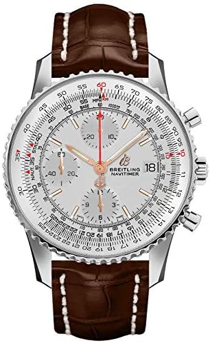 Breitling Navitimer 1 Chronograph 41 A1332412/G834-739P men's watch. Features a polished stainless steel case and brown leather strap with crocodile pattern. Polished stainless steel bidirectional rotating bezel. Mercury silver dial with luminescent hands and hour markers. Date displayed in dial aperture at 3 o'clock. Chronograph with large central chronograph seconds hand, 30 minute counter sub-dial at 12 o'clock and 12 hour counter sub-dial at 6 o'clock. Small seconds sub-dial at 9 o'clock. Powered by the Breitling Caliber 13 self-winding automatic COSC Chronometer certified movement which boasts as 42 hour power reserve, beats at 28,800 vph and contains 25 jewels. A cambered scratch resistant sapphire crystal glareproofed on both sides protects the dial. The case is round, 41mm in diameter, weighs 91g and is 14.44mm thick. Inlet size: 22mm. Non screw-locked crown with 2 gaskets. Screw down case back. Stainless steel tang buckle. Water resistant to 30 meters / 100 feet. Functions: hours, minutes, small seconds, date, chronograph, slide rule. Sport watch style. Swiss made.