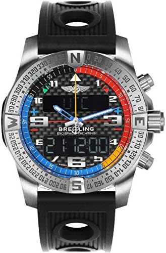 Breitling Exospace B55 Yachting EB551222/BG45/201S/E20D.2 men's watch. Features a brushed titanium case with bidirectional rotating rider-tab bezel and a black Ocean Racer rubber strap. The Carbon dial has an analog display and an electronic 12/24hr LCD digital display with multiple functions. The hour hand, minute hand and hour markers are luminescent. Powered by the Breitling Caliber B55 SuperQuartz thermocompensated quartz electronic chronometer certified movement. A charging kit is included to recharge the battery. A scratch resistant sapphire crystal which is glareproofed on both sides protects the dial. The case is round, 46mm in diameter, weighs 80g and is 15.25mm thick. The crown is non screw-locked, has 2 gaskets and an integrated push button. The case back is screwed in. Inlet width: 24 mm. Titanium deployment buckle. Water-Resistant to 100 meters / 330 feet. Functions: hours, minutes, seconds, date, chronograph, electronic tachymeter, a "countdown/countup" system, a "chrono flight" and "chrono regatta" device for recording flight and regatta times respectively while memorizing departure and arrival times, backlighting (white light), UTC worldtime, 7 daily alarm feature, smartphone pairing capability, bluetooth technology and battery state-of-charge indicator. Sport watch style. Swiss made.