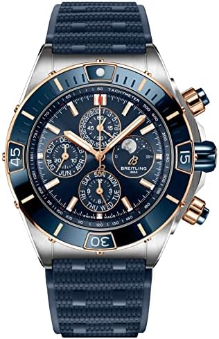 Blue dial. Silver-tone stainless steel case with a blue rubber band. Automatic movement. 100 meters / 330 feet water resistance. Uni-directional Rotating bezel. Fold Over with Safety Release clasp. Case size 44 mm x 14.5 mm. Breitling U19320161C1S1 Super Chronomat Watch.