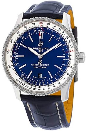 Stainless steel case with a blue (alligator) leather strap. Bi-directional rotating stainless steel bezel. Blue dial with luminous silver-tone hands and index hour markers. Minute markers. Tachymeter markings around the outer rim. Dial Type: Analog. Luminescent hands and markers. Date display at the 6 o'clock position. Breitling calibre 17 automatic movement, based upon ETA 2824-2, containing 25 Jewels, bitting at 28800 vph, and has a power reserve of approximately 42 hours. Scratch resistant sapphire crystal. Pull / push crown. Solid case back. Round case shape. Case size: 41 mm. Case thickness: 10 mm. Band width: 22 mm / 20 mm. Tang clasp. Water resistant at 30 meters / 100 feet. Functions: date, hour, minute, second. Luxury watch style. Watch label: Swiss Made. Breitling Automatic Blue Dial Blue Leather Mens 41 mm Watch A17326211C1P3.