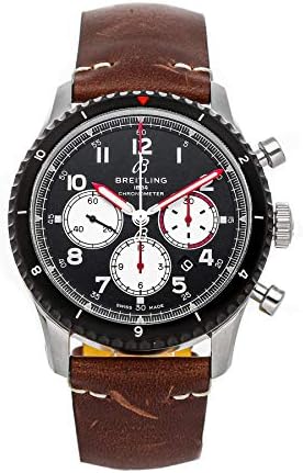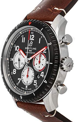 Black dial enhanced by luminous silver-tone hands. Silver-tone stainless steel case with a brown (calfskin) leather band. Automatic movement. 100 meters / 330 feet water resistance. Bi-Directional Rotating bezel. Scratch Resistant Sapphire crystal. Transparent caseback. Fold Over with Safety Release clasp. Screw Locked crown. Case size 43 mm x 13.87 mm. Band 23 mm x long. Breitling AB01194A1B1X2 Aviator 8 Watch.