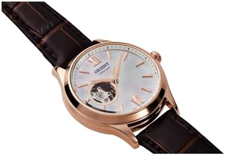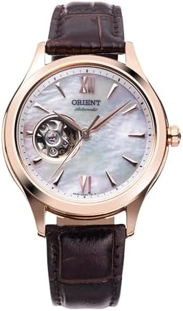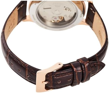 Orient Japanese watch company renowned for its excellence and reliability. The Orient Classic collection never goes out of style. Essential simplicity that runs through generations with ease, because the classics don't need to change. Eternal for a reason. Elegant automatic watch for women. Classic female watch with 36mm rose gold stainless steel round case. Mineral glass, clear back Chocolate brown leather strap, antique white dial. Mechanical movement with 3 ball display, calibre F6T22. Equipped with 22 jewels, it has a daily accuracy of +25/-15, manual and automatic winding. Water resistant (small splashes and hand washing, no shower)