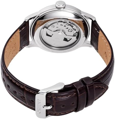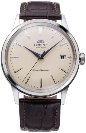 Orient Japanese watch company renowned for its excellence and reliability. The Orient Classic collection never goes out of style. Essential simplicity that runs through generations with ease, because the classics don't need to change. Eternal for a reason. The Orient Bambino is a beautifully crafted 38mm watch, perfect for any occasion. With its simple and elegant design, this watch is sure to impress anyone who sees it. Classic men's watch with a round silver grey stainless steel case (38 mm), mineral glass, transparent case back and beige dial. Chocolate brown leather strap with pin buckle. Mechanical movement with calibre F6724, 22 jewels, 3 ball display and date calendar. Accuracy of +25/-15 sec per day, manual and automatic winding. Water resistant (small splashes and hand washing, no shower)