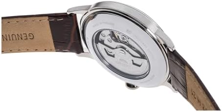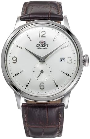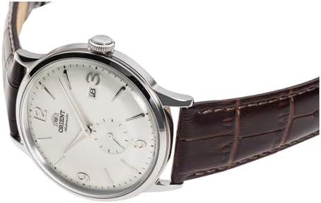 Orient Japanese watch company renowned for its excellence and reliability. The Orient Classic collection never goes out of style. Essential simplicity that runs through generations with ease, because the classics don't need to change. Eternal for a reason. Orient Bambino Small Seconds is an intriguing combination of classic charm and exceptional watchmaking. The flagship of this version is the leaflet for small continuous seconds at 6 o'clock. Classic men's watch with silver grey stainless steel round case (41mm), push crown, mineral glass and clear caseback. Brown leather strap with pin buckle. White Dial F6222 24 jewels mechanical movement with date calendar and 3 ball display. Daily accuracy of +25/-15 and manual winding. Automatic operation. Water resistant (small splashes and hand washing, no shower)