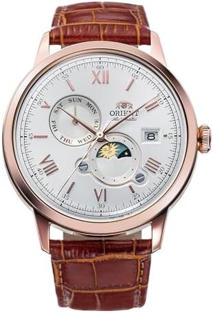 Orient Japanese watch company renowned for its excellence and reliability. The Orient Classic collection never goes out of style. Essential simplicity that runs through generations with ease, because the classics don't need to change. Eternal for a reason. This stylish Sun & Moon timepiece features an elegant dial with a rotating disc that marks the transition from day to night for 24 hours. Classic men's watch, 42 mm rose gold stainless steel round case, mineral glass, clear caseback. Brown leather strap with pin buckle. White Dial F6B24 mechanical movement with 22 rubies and accuracy of +25/-15 sec/day. 3 ball display with day and date calendar, manual and automatic winding. Water resistant (small splashes and hand washing, no shower)