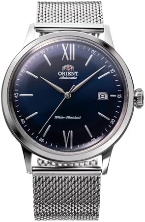 Orient Japanese watch company renowned for its excellence and reliability. The Orient Classic collection never goes out of style. Essential simplicity that runs through generations with ease, because the classics don't need to change. Eternal for a reason. Elegance is simplicity, and simplicity is one of the hardest things. This new version of the legendary Bambino Classic family features a dial with subtle indexes including the 6 and 12 in Roman numeral, and alpha balls. Classic men's watch with silver grey stainless steel round case (41 mm), mineral glass, clear case, blue dial and adjustable stainless steel strap. Mechanical movement with calibre F6724, 22 jewels, 3 ball display and date calendar. Accuracy of +25/-15 sec per day, manual and automatic winding. Water resistant (small splashes and hand washing, no shower)