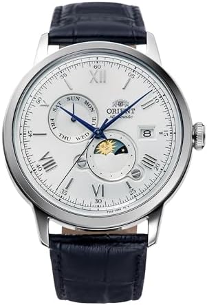 Orient Japanese watch company renowned for its excellence and reliability. The Orient Classic collection never goes out of style. Essential simplicity that runs through generations with ease, because the classics don't need to change. Eternal for a reason. This stylish Sun & Moon timepiece features an elegant dial with a rotating disc that marks the transition from day to night for 24 hours. Classic men's watch with 42mm silver grey stainless steel round case, white dial, mineral glass, clear case back and black leather strap with pin buckle. F6B24 mechanical movement with 22 rubies and accuracy of +25/-15 sec/day. 3 ball display with day and date calendar, manual and automatic winding. Water resistant (small splashes and hand washing, no shower)