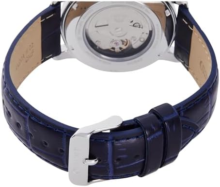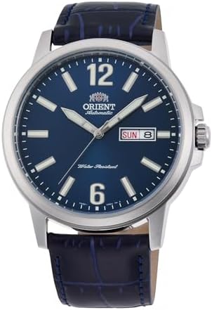 The best of both worlds. An exemplification of watchmaking quality and modern design, the watches from the Orient Contemporary collection offer elegance for special moments and versatility for everyday life. An easy to read timepiece for those who are constantly on the move. Men's casual watch with round silver grey stainless steel case (42mm), mineral glass and clear caseback. Blue leather strap with buckle, blue dial F6922 mechanical movement with 22 jewels, 3 ball display and day date calendar. Daily accuracy +25/-15, manual and automatic winding included. 5 ATM water resistant (not suitable for swimming)