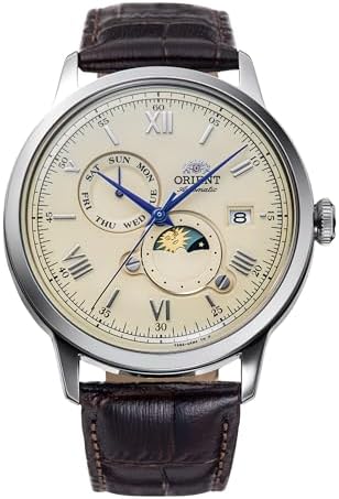 Orient Japanese watch company renowned for its excellence and reliability. The Orient Classic collection never goes out of style. Essential simplicity that runs through generations with ease, because the classics don't need to change. Eternal for a reason. This stylish Sun & Moon timepiece features an elegant dial with a rotating disc that marks the transition from day to night for 24 hours. Classic men's watch with 42mm silver grey stainless steel round case, mineral glass and clear caseback. Chocolate brown leather strap and beige dial. F6B24 mechanical movement with 22 rubies and accuracy of +25/-15 sec/day. 3 ball display with day and date calendar, manual and automatic winding. Water resistant (small splashes and hand washing, no shower)