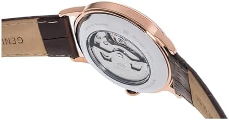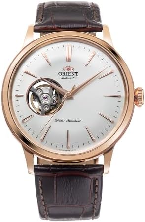 Rose gold-tone stainless steel case with a brown leather strap. Fixed rose gold-tone stainless steel bezel. White dial with rose gold-tone hands and index hour markers. Minute markers around the outer rim. Dial Type: Analog. F6T22 automatic movement. Scratch resistant mineral crystal. Pull / push crown. Transparent case back. Round case shape, case size: 40.5 mm, case thickness: 12 mm. Band width: 21 mm. Tang clasp. Water resistant at 50 meters / 165 feet. Functions: hour, minute, second. Casual watch style. Watch label: Japan Movt. Orient Open Heart Automatic White Dial Men's Watch RA-AG0001S.