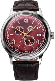 Orient Japanese watch company renowned for its excellence and reliability. The Orient Classic collection never goes out of style. Essential simplicity that runs through generations with ease, because the classics don't need to change. Eternal for a reason. The Orient Classic Bambino V8 combines elegance and functionality in a classic design. The day of the week, 24h and date display makes it practical and versatile. The Bambino V8 is the perfect choice for those who want a refined and functional watch. Classic men's watch with 41 mm silver grey stainless steel round case, mineral glass, clear caseback. Carmine Red Leather Strap, Wine Red Dial Mechanical movement with calendar day and date, 3 ball display. Calibre F6B22 with 22 jewels, daily accuracy +25/-15. Manual and automatic winding. Water resistant (small splashes and hand washing, no shower)