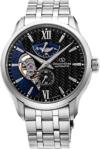 Brown Blue (Cut-Out) dial enhanced by luminous rose gold-tone hands. Silver-tone stainless steel case with a silver-tone stainless steel band. Automatic movement. 100 meters / 330 feet water resistance. Fixed bezel. Scratch Resistant Sapphire crystal. Transparent caseback. Deployment with Push Button Release clasp. Pull / Push crown. Case size 41 mm x 11.5 mm. Band 22 mm x long. Orient RE-AV0B02Y00B Orient Star Watch.