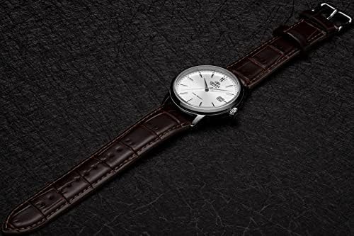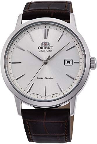 High-quality watch from Orient. Brown strap made of high-quality grained leather with silver pin buckle. Silver case made of stainless steel with a diameter of 41 mm. Silver dial with sunburst finish, silver line index and 3 silver hands, date display and Orient logo. The watch has a water resistance of 5 bar: the watch is suitable for everyday use such as B. Bathing, showering or washing hands. The watch is an automatic watch