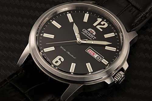 High-quality watch from Orient. Black strap made of high-quality grained leather with silver stainless steel pin buckle. Silver case made of stainless steel with a diameter of 42 mm. Black dial with line index and 3 silver hands with luminous function, 2 Arabic numerals, day and date display and Orient logo. The watch has a water resistance of 5 bar: the watch is suitable for everyday use such as B. Bathing, showering or washing hands. The movement is a quartz movement