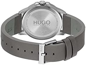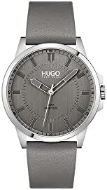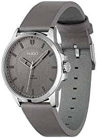 CONTEMPORARY AND CLASSIC AT ONCE: The #FIRST from HUGO Watches is a three-hand timepiece offering understated modern style. The vertically brushed dial is detailed with minute and second markers as well as stamped indexes, and encircled by a minimalist polished case. -- QUALITY MATERIALS, EYE-CATCHING STYLE: Men's 43 mm stainless steel case, grey dial with printed index, grey leather strap. -- QUARTZ ACCURACY: Quartz movement provides precise timekeeping and minimal maintenance for a reliable and worry-free timepiece. -- DURABLE MINERAL CRYSTAL: Made from glass and protects watch from scratches.