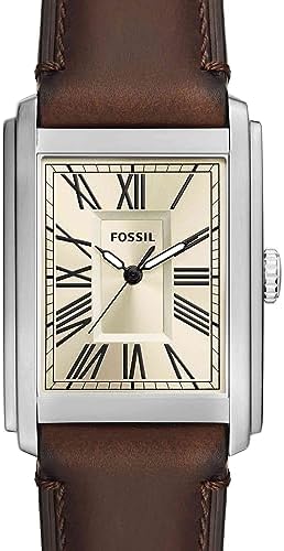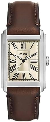 Fossil Watch from the Carraway collection for men. 3 ball quartz movement, made of stainless steel with a rectangular case in mixed silver finish. The dial is cream in colour. Case diameter: 30 mm. Case Thickness: 9mm Lug spacing: 22 mm. The strap is made of leather with a shiny finish. Strap colour: brown. Band Type:Band Clasp: pin buckle. The water resistance is 10 ATM. Reference is: FS6012