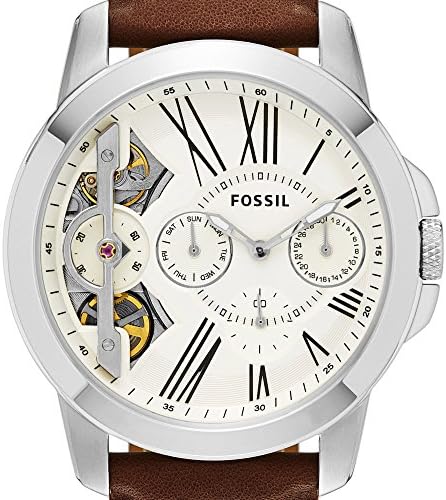 FOSSIL men watch - Round stainless steel case (diam. 44 mm) in polished and brushed finishing - 5 ATM water pressure resistance construction Brown genuine leather strap with brown stitching - Buckle Off-white dial with black roman numbers and skeleton effect with silver and gold details from 8 to 10 - 2 hand quartz movement with day and date and automatic movement for seconds - Silver and luminous hollow hands - Mineral glass The design of the fossil boxes is always different and changes with each season