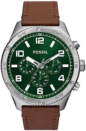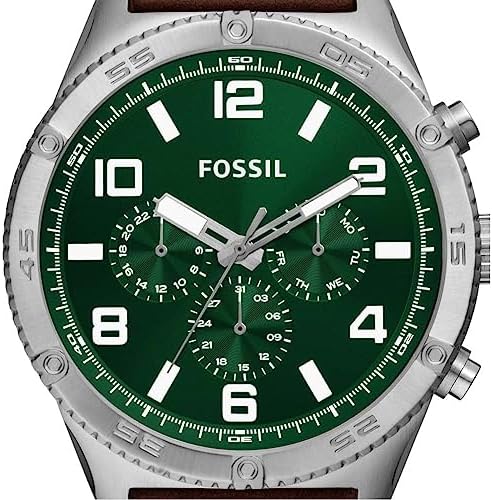 Brand Name Fossil Model number BQ2801 Part Number BQ2801 Item Shape Round Dial window material type Mineral Glass Clasp Buckle Case material Stainless Steel Case diameter 50 millimetres Band Material Leather Band width 24 millimetres Band Color Brown Dial color Green Calendar Date-Week-Month Special features Chronograph Item weight 152 g Movement Quartz Display Type analogue