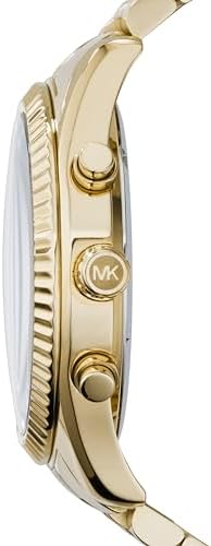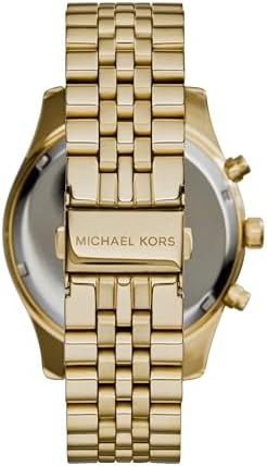 A Sophisticated and Elegant timepiece brought to you by Michael Kors Watches. Brushed and polished gold tone stainless steel case. Comfortable stainless steel link bracelet with a fold over deployment clasp. Black tone dial has gold tone hands and hour markers. Chronograph feature. Date display at the fourth hour. Precise Quartz movement. Scratch resistant mineral crystal. Water resistant 100m. Case measures 45mm diameter by 13mm thick.