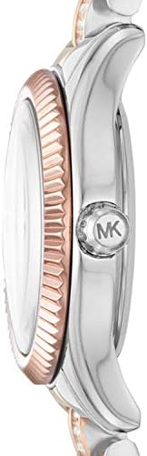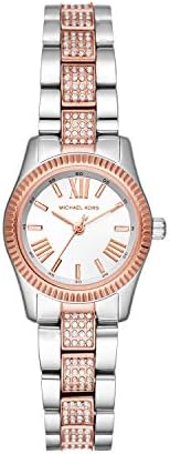 This Michael Kors Lexington watch features a white sunray dial with rose gold-tone Roman numeral and stick indexes, a stainless-steel case with a textured rose gold-tone topring and is complete with a 3-link two-tone bracelet with a pavé center link.26mm case, 14mm band width, mineral crystal, Quartz movement with 3-hand analog display, imported.. Round stainless steel case, with a white dial.. Two-Tone, stainless steel bracelet. Water resistant up to 50m: Wearable while swimming in shallow water.