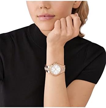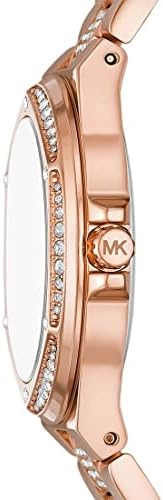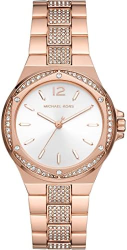 Michael Kors 37mm lennox watch features a white sunray dial, three-hand movement and rose gold-tone stainless steel bracelet with pave centerlink. 37mm case, 20mm band width, mineral crystal, Quartz movement 3-hand analogue display, imported. Round stainless steel case, with a white dial. Rose gold, stainless steel bracelet. Water resistant up to 50m: Wearable while swimming in shallow water.