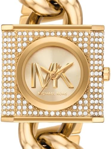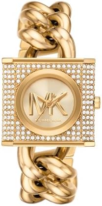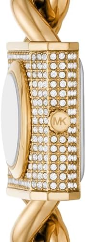 Michael Kors The 25mm MK chain lock watch features a gold logo dial, pave case, three-hand movement and gold stainless steel bracelet.
