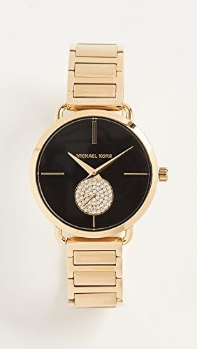This MICHAEL KORS Portia watch features a gold tone case, a black sunray dial with a pave subdial and is complete with a polished H link bracelet. Case - Case Material: Stainless Steel (polished) - Case Shape: Round - Case Colour: Gold - Crystal: Mineral crystal.