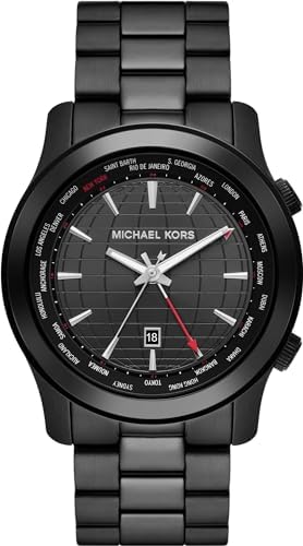 Michael Kors' 45mm Runway watch features a black globe detailed dial, dual time movement and black stainless steel bracelet.