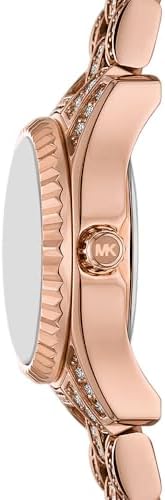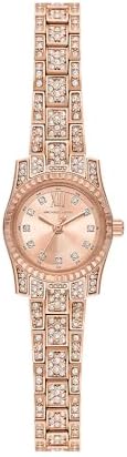 Michael Kors' 19mm Lexington watch features a rose gold sunray dial, three-hand movement and rose gold-tone stainless steel all over pavé bracelet. 19mm case, 10mm band width, mineral crystal, Quartz movement with 3-hand analog display, imported. Round stainless steel case, with a rose gold dial. Rose Gold, stainless steel bracelet. Water resistant up to 50m: Wearable while swimming in shallow water.