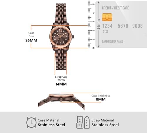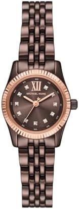 Michael Kors' 26 mm Lexington watch features a chocolate sunray dial, three-hand movement and chocolate stainless steel bracelet. 26mm case, 14mm band width, mineral crystal, Quartz movement with 3-hand analogue display, imported. Round stainless steel case, with a brown dial. Brown, stainless steel bracelet. Water resistant up to 50m: Wearable while swimming in shallow water.