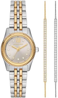 Michael Kors' 26mm Lexington watch and bracelets gift set features an oyster sunray dial, three-hand movement and two-tone stainless steel bracelet, paired back to gold-tone and stainless steel pavé slider bracelets. 26mm case, 14mm band width, mineral crystal, Quartz movement with 3-hand analog display, imported. Round stainless steel case, with a white dial. Two-Tone, stainless steel bracelet. Water resistant up to 50m: Wearable while swimming in shallow water.