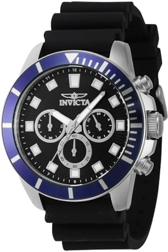 The Invicta 46079 has a 45 mm stainless steel case with a black dial. This model is powered by an accurate Quartz movement. 5 bar waterproof. This model is part of the Invicta Pro Diver collection.