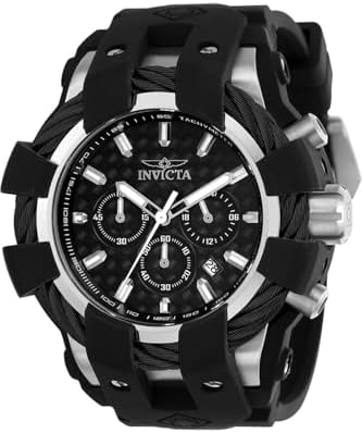 This Invicta men's watch is part of the bolt collection. This Invicta 23855 has a 48 millimeters stainless steel case with a black dial. This model is powered by an accurate quartz movement. The Invicta bolt watch has a 32 millimeters silicone band.This Invicta watch is protected by mineralglass. The stainless steel watch is 20 bars water resistant and includes a yellow Invicta box and an instruction manual.
