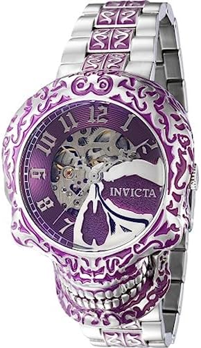 Purple dial enhanced by silver-tone hands. Silver and Purple gl and stainless steel case with a two-tone (purple and silver-tone) stainless steel band. Automatic movement. 100 meters / 330 feet water resistance. Fixed bezel. Flame Fusion crystal. Transparent See Through caseback. Fold over safety clasp. Pull / Push crown. Case size 50.5 mm. Band 28 mm x 7.50 incheslong. Invicta 42302 Artist Watch.