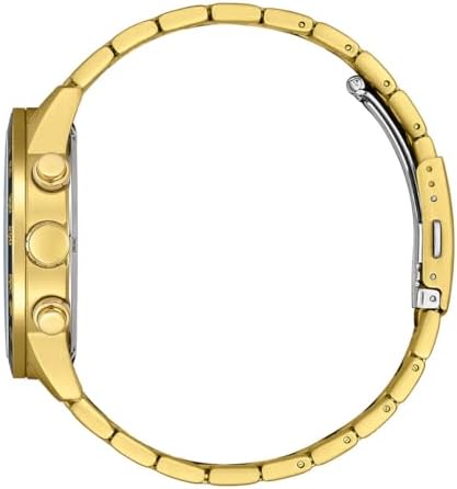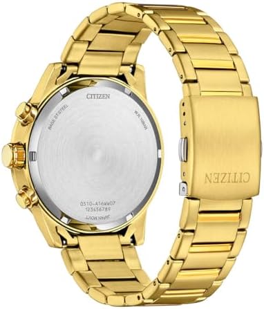 This Citizen Quartz Chronograph is a sophisticated men's watch featuring a robust stainless steel case. This Chronograph watch has a Calendar function: Date as well as Stop Watch , Stop Watch , Luminous Hands and Tachymeter High quality 21 cm length and 21 mm width Gold Stainless steel strap with a Fold over with push button clasp Case diameter: 44 mm,case thickness: 11 mm, case colour: Gold and dial colour: Black Water resistant: 10 bars -Weight: 144 g