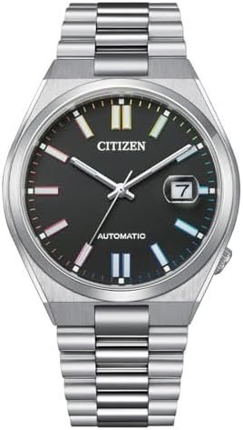 This Citizen Mechanical NJ0151-53E Tsuyosa special edition oriented men's watch has the barrel shaped steel case. The solid steel bracelet with double safety clasp. Black dial with colorful indexes. Water resistance: 5 ATM. Diameter: 40 mm. Functions: Three hands and calendar with magnifying glass. Weight: 138 gr. Sapphire crystal, self-winding automatic movement 8210 (21,600 oscillations per hour) 21 jewels. Average daily accuracy interval: -20 to +40 seconds, depending on environmental conditions and use. 40 hours power reserve (if at 100%) and analog display. Enjoy your Citizen watch.