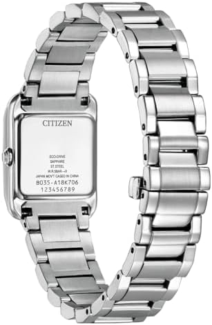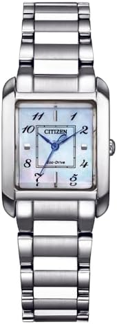 This watch has an Eco-drive technology (Recharged by any light source; no need for ever a battery). This Analogue watch has a function: Solar Powered High quality 19 cm length and 15 mm width Silver Stainless steel strap with a Deployment clasp Case measurement: 21 X 30 mm,case thickness: 7 mm, case colour: Silver and dial colour: Mother of pearl Water resistant: 5 bars-Weight: 69 g