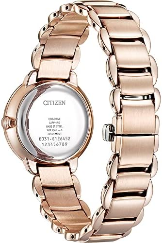 This high quality watch has an Eco-drive technology (Recharged by any light source; no need for ever a battery) -The watch has a function: Solar Powered High quality 19 cm length and 15 mm width Rose Gold Stainless steel strap with a Deployment clasp Case diameter: 28 mm,case thickness: 8 mm, case colour: Rose Gold and dial colour: Rose gold Water resistant: 5 bars -Weight: 68 g