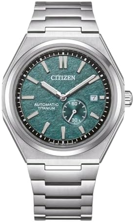 This watch has an automatic watch movement ( recharged by any movement with your wrist; never needs a battery) This Analogue watch has a calendar function: Date , Luminous Hands and Luminous Numbers High quality 21 cm length and 23 mm width Silver Titanium strap with a Fold over with push button clasp Case diameter: 41 mm,case thickness: 11 mm, case colour: Silver and dial colour: Green Water resistant: 10 bars -Weight: 102 g