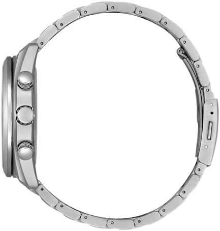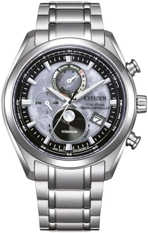 This high quality watch has an Eco-drive technology (Recharged by any light source; no need for ever a battery). This Multi Dial watch has a calendar function: Day-Date , Solar Powered , Radio Controlled , Step Tracker , 24-hour Display and Luminous Hands High quality 21 cm length and 21 mm width Silver Titanium strap with a Fold over with push button clasp Case diameter: 43 mm,case thickness: 11 mm, case colour: Silver and dial colour: Grey Water resistant: 10 bars-Weight: 102 g