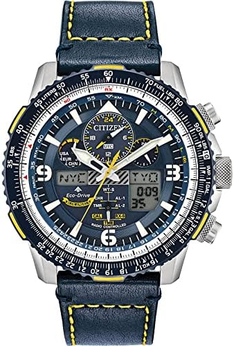 This high quality watch has an Eco-drive technology (Recharged by any light source; no need for ever a battery) -The watch has a calendar function: Day-Date, Radio Controlled, Solar Powered, Stop Watch, Dual Time, Alarm High quality 21 cm length and 23 mm width Blue Leather strap with a Buckle Case diameter: 46 mm,case thickness: 14 mm, case colour: Silver and dial colour: Blue Water resistant: 20 bars -Weight: 110 g