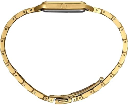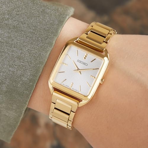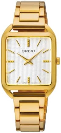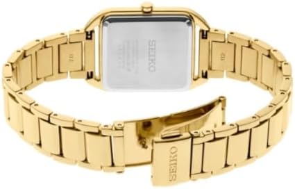 Gold-tone dial. Yellow Gold-tone stainless steel case with a yellow gold-tone stainless steel band. Quartz movement. 50 meters / 165 feet water resistance. Fixed bezel. Fold Over with Safety Release clasp. Case size 26 mm x 6.4 mm. Seiko SWR078 Essentials Watch.
