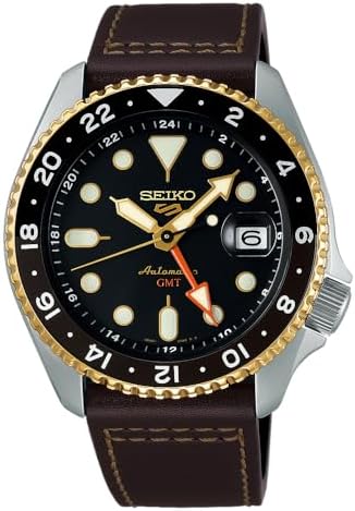 The Seiko 5 sports collection welcomes the new SKX GMT watches. Following the Black Boy, Navy Boy and Orange Boy models, the collection is enriched with new trendy colours. The SSK036K1 is the first model in the Seiko 5 GMT series to feature a robust brown leather strap. It is undoubtedly sporty, with a retro touch thanks to the gold accents on the hands and bezel.