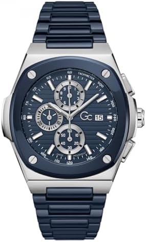 This Guess Collection Y99019G7MF Coussin oriented watch for men, has a two-tone stainless steel case with circular shape. The bracelet is blue ceramic , blue dial color and hands and indexes in fluorescent steel. Blue silicone bezel. Mineral crystal, quartz movement and analog display. Type of clasp: Deployant with pusher. Functions: Chronometer, three hands and calendar. Water resistance: 10 ATM. Diameter: 44 mm. Swiss movement. Enjoy your Guess Collection watch.